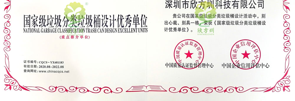 欣方圳擁有數(shù)十款國家知識產權垃圾桶專利證書,專利產品囊括不銹鋼、鋼板、玻璃鋼等市場主流垃圾桶應用材質,專業(yè)生產廠家給客戶更多選擇空間。