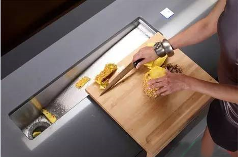 水槽是個整合的垃圾處理裝置,水槽采用了傾斜設計,垃圾會沿著斜坡下沉。另外,這個水槽還采用了靈活的觸摸技術,清洗周期由固定不變的藍光顯示,垃圾處理周期由閃爍的藍光顯示。